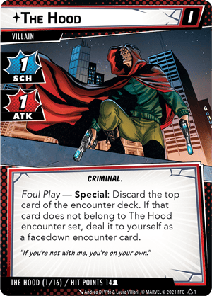 As the heroes battle the Hood, they will repeatedly be forced to resolve his Foul Play ability through cards like Establish Dominance (The Hood, 7) and Madame Masque (The Hood, 10). A side-effect of this ability is that it swiftly burns through the Hood’s deck, causing him to gradually build up acceleration tokens on the main scheme. As he completes his schemes, the Hood draws more and more criminals into his organization with Promised Prosperity (The Hood, 5A), permanently adding additional encounter sets from the set-aside pool into the game. Add in the chance for some Field Recruitment (The Hood, 12), and suddenly the Hood’s budding empire has grown into a threat that even some of Earth’s mightiest heroes might struggle against!
