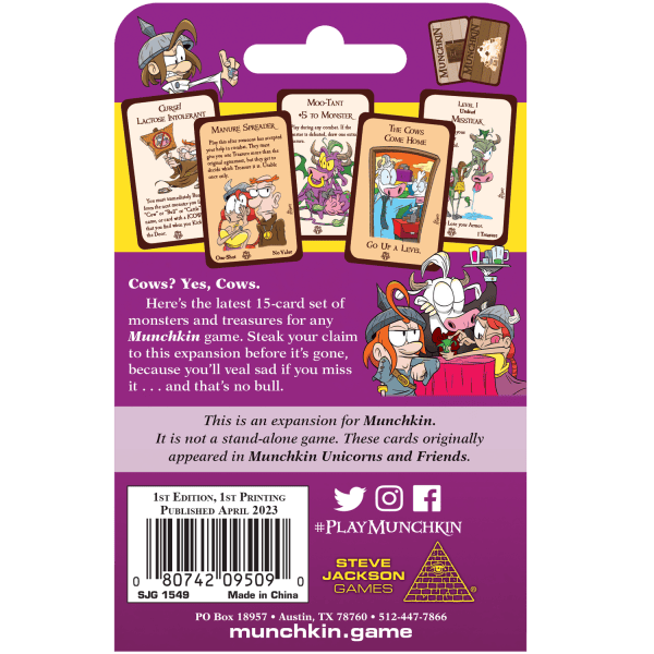 What’s moo? This is – the latest 15-card set of monsters and Treasures for any Munchkin game! Steak your claim to this comical collection of cows before it’s gone. You’ll veal very sad if you miss it . . .and that’s no bull.