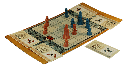 Each player has two open cards that each display a possible move for any of his pieces. There is a fifth card that cannot be used by either player. On a player’s turn, he chooses one of his cards, moves one of his pieces according to the chosen card, then replaces the card he used with the fifth card. The other player then chooses one of his cards, moves accordingly, and exchanges that card with this fifth card which is, of course, the card the first player just used.