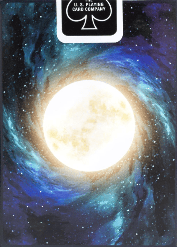 The tuck case shines with silver foil and the unique card back features the second brightest object of the celestial sky. The card faces feature custom pips and contrasting suits to aid playability.
