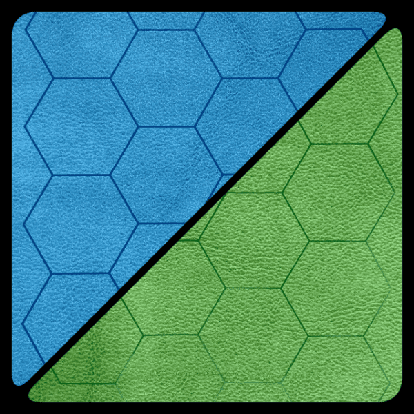 The printed patterns on these two-colored vinyl mats will be the same on both sides; squares on both sides or hexes on both sides. This is a departure from our existing reversible single-colored mats. They will only be printed with 1” squares or 1” hexes. They will not be available in 1½” hex and square sizes.