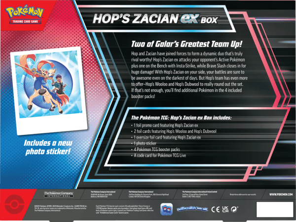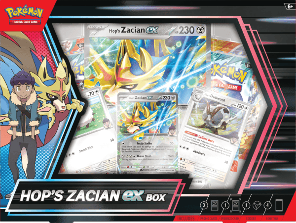 Hop and Zacian have joined forces to form a dynamic duo that’s truly rival worthy! Hop’s Zacian ex attacks your opponent’s Active Pokémon plus one on the Bench with Insta-Strike, while Brave Slash closes in for huge damage! With Hop’s Zacian on your side, your battles are sure to be awesome even on the darkest of days. But Hop’s team has even more to offer—Hop’s Wooloo and Hop’s Dubwool to really round out the set. If that’s not enough, you’ll find additional Pokémon in the 4 included booster packs!
