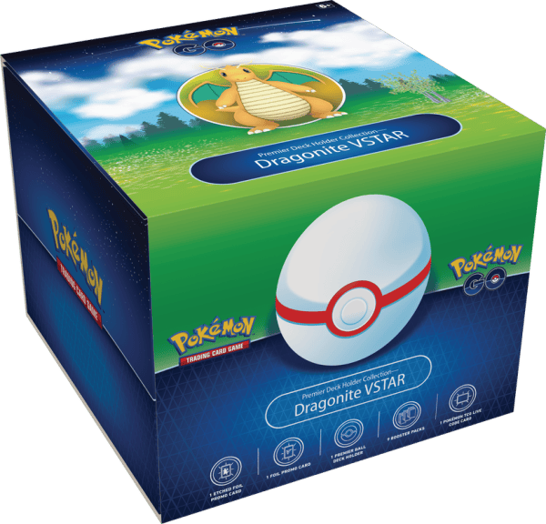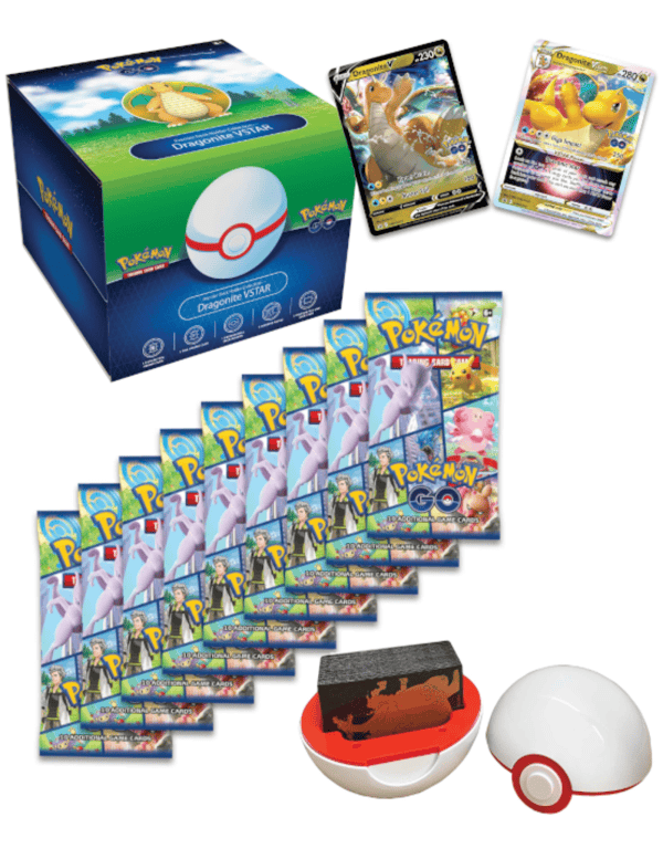 An epic Raid Battle brings mighty rewards: a powerful Dragonite VSTAR for your collection and a Premier Ball holder for your favorite deck! With a VSTAR Power that shares loads of Energy with your Pokémon, Dragonite VSTAR soars to strategic heights, and you’ll receive it along with Dragonite V in this special collection featuring the Pokémon TCG: Pokémon GO expansion. To top it off, the sturdy Premier Ball case holds a fully sleeved deck of cards for an ultimate statement of Pokémon Trainer style!