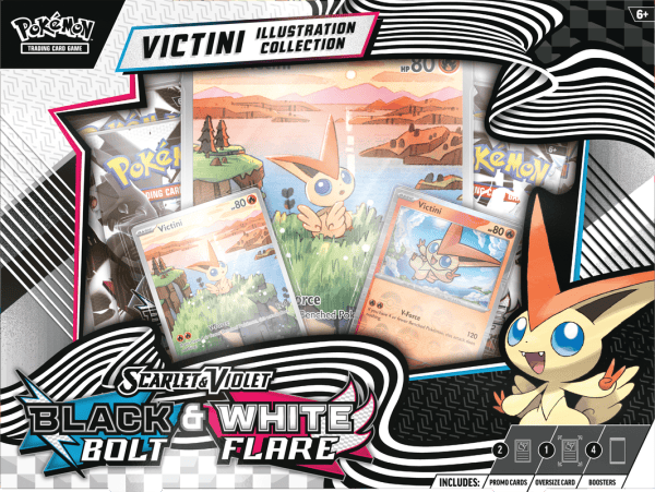 The Mythical Pokémon Victini is said to create infinite energy that it can share with its friends, and now you can team up with it in your own Pokémon TCG decks! In this collection, you get an illustration rare-style foil promo card and a premium parallel foil card featuring Victini, along with an oversize card for display. You’ll find even more Pokémon from the Unova region inside the included booster packs from the special Scarlet & Violet—Black Bolt and Scarlet & Violet—White Flare expansions.
