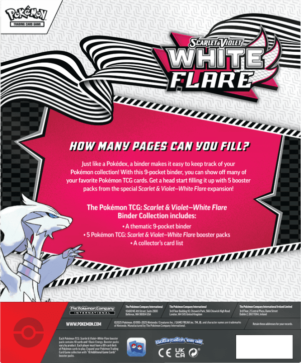 Just like a Pokédex, a binder makes it easy to keep track of your Pokémon collection! With this 9-pocket binder, you can show off many of your favorite Pokémon TCG cards. Get a head start filling it up with 5 booster packs from the special Scarlet & Violet—White Flare expansion!