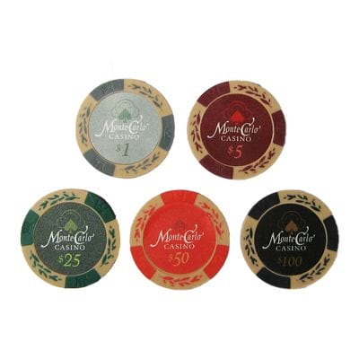 They have a fabulous tactile feel and solid sound that you’ll enjoy game after game. Each “Monte Carlo Casino” white coloured chip is distinctively decorated with coloured stripes with embossed crowns and laurel leaves for a unique old world look. Neatly stored in a deluxe aluminum case which features extruded aluminum edges for durability, black flocked chip tray and waffle foam in the lid. Complete with two decks of cards, five casino dice, and a dealer button. 150 Grey ($1), 150 Maroon ($5), 100 Dark Green ($25), 50 Blue ($50) and 50 Black ($100) chips in the set.