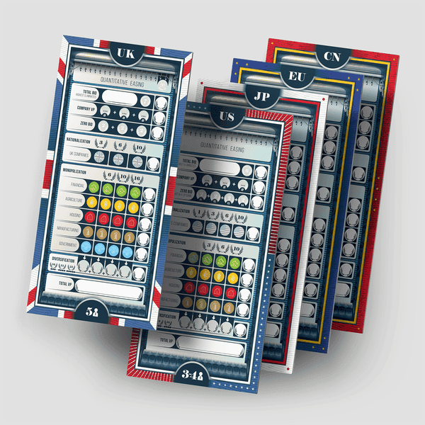 In Q.E., a term that stands for “quantitative easing”, you play the role of a central bank. You bid on different size companies to accumulate various levels of victory points. The amount you bid is unlimited since you are the central bank and you own the printing press! After the initial “open” bid by the lead player, the other players bid in secret. After the sixteen companies have been “bailed out”, bonus victory points are awarded for company sets of nationalization, monopolization, and diversification.