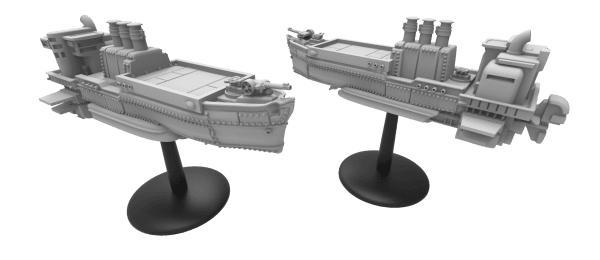 In the airship module, 2 airship tiles are randomly paired at the beginning of the game (1 passive and 2 aggressive; there are 16 total tiles). Each players airship miniature (a new type of unit; 1 big miniature for each of the 7 factions [the sculpts are identical, and the bases are different colors to match the factions]) has those abilities, as well as the core ability that airships are free to move onto any territory (land or water) and across rivers. Each player starts with their airship on their home base, so they can start moving out of their home area right away. The airship miniatures measure 104x34x42mm, and they have clear, plastic, removable stands/bases.