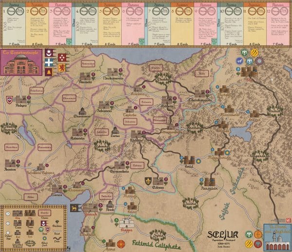 Seljuk—Volume V in Volko Ruhnke’s Levy & Campaign series—brings players into the challenges of medieval logistics and maneuver across Asia Minor during the clash between Orthodox Christian and Muslim power in the lead-up to the climactic Battle of Manzikert. Players will assume the role of either the Eastern Romans or Seljuk Turks as they seek to make their mark on this historic land. Asymmetric victory objectives and new and unique additions to the Levy & Campaign system mean a dynamic game of cat and mouse between these two great powers.