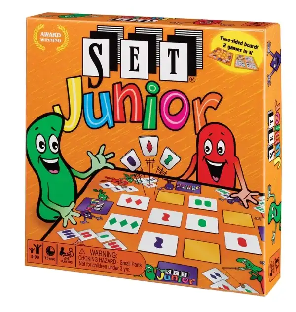 One side of the double-sided game board in SET Junior features three 3×3 squares, with each line in a square forming a set. Players take turns drawing a tile from the stack — with each tile featuring 1-3 symbols in one of three colors and in one of three shapes — and placing that tile on the game board. Each time a player completes a set by placing a tile, she claims a point chip and whoever collects the most chips wins.