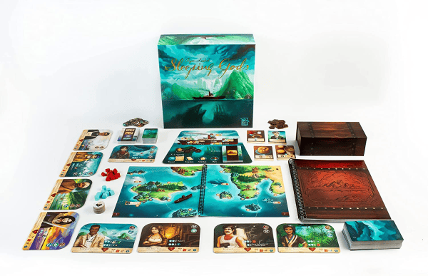 Sleeping Gods is a campaign game. Each session can last as long as you want. When you are ready to take a break, you mark your progress on a journey log sheet, making it easy to return to the same place in the game the next time you play. You can play solo or with friends throughout your campaign. It’s easy to swap players in and out at will. Your goal is to find at least fourteen totems hidden throughout the world. Like reading a book, you’ll complete this journey one or two hours at a time, discovering new lands, stories, and challenges along the way.