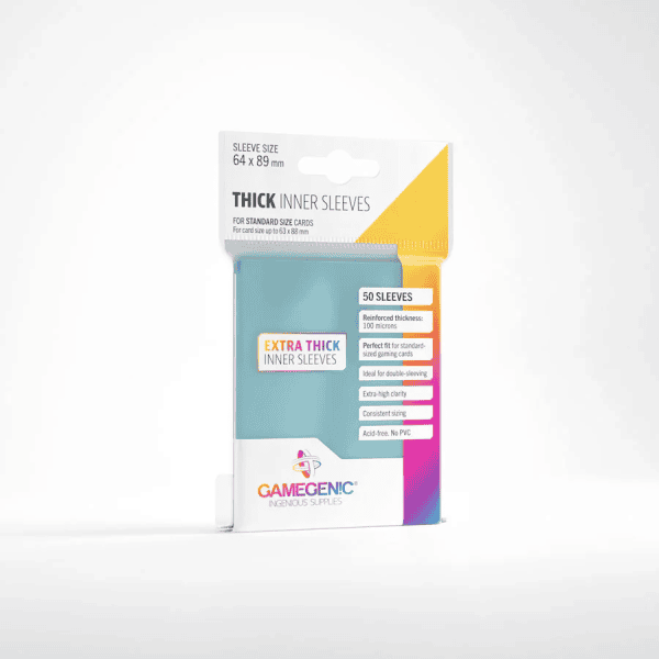 Keeping their cards safe and sound is an essential need for many players. Our Thick Inner Sleeves offer an extra layer of sturdy protection. Compared to conventional inner sleeves, these are twice as thick, bringing an increased thickness of 100 microns to the table. Even with that much protection, our Thick Inner Sleeves still allow for double-sleeving (sleeve-within-sleeves), perfectly fitting inside standard sleeves. Additionally, they can be used as regular sleeves for card and board games. Each pack contains 50 sleeves.