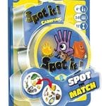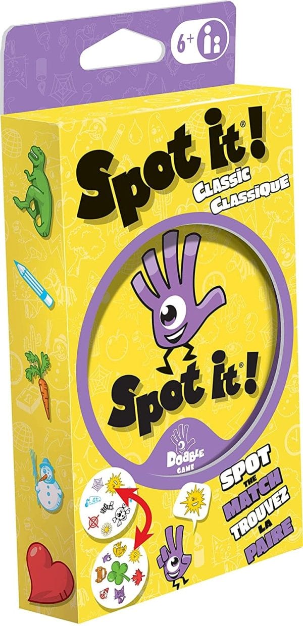 Spot It! is a visual perception card game in which players race to find the one matching picture between one card and another. The pictures can be different sizes. The cards are round and feature an assortment of colorful images of items like insects, plants, symbols, and smiley faces. Every card is unique, and has only one picture in common with each card in the deck. The game is very portable and perfect for travel!