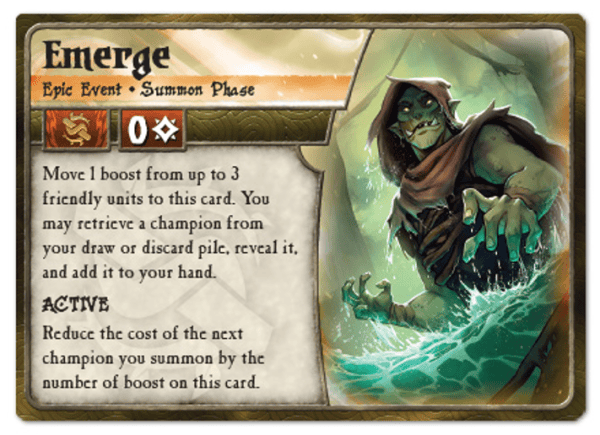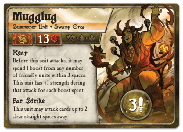The Swamp Orcs have emerged from the murky depths once again, led by the almighty Mugglug! This summoner takes center stage with her powerful extended melee reach and ability to reap boost from allies to fuel supercharged strikes. Cultivate a bog of combatants to generate boost across as many units as you can field, then cash in boost for powerful effects, whether it be a lethal blow from Mugglug, or a deep discount on an Emerging champion of the swamp!