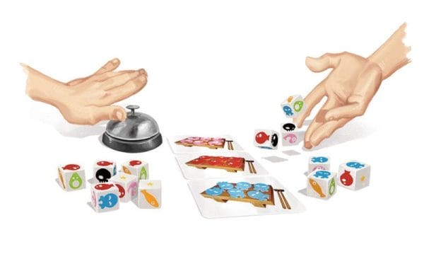 Be fast! Roll the dice faster than your opponent to cook the sushi recipe. Keep looking at your dice but also at your opponent’s… at the same time! Sushi Dice is a quick-playing dice game in which players compete head-to-head to complete a sushi dish first, with the sides of the dice representing food used in the composition of sushi. Each turn, three cards are revealed in the center of the table, and two players compete with six dice each, rolling the dice simultaneously and continually to try to match one of the dishes first. You can set aside any dice you want to keep, but if one of the players notices that his opponent has rolled a Yuck symbol (before the opponent can reroll it), then he can yell out “Yuck!” and force that player to reroll any dice they’ve set aside. If any non-active player notices that both players have a Yuck symbol at the same time, they can yell “Chop!” and that ends their turn immediately, with the dice passing to the next players. Whoever completes a dish first keeps that card, and the first player to collect 4-6 cards (depending on the number of players) wins.