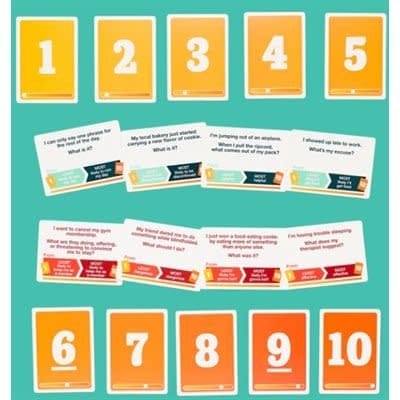 First, read out a simple question (ex. I’m locked in a tiny room. What else is locked in here with me from cutest to scariest). Then everyone is assigned a secret number from one to ten. Next, each player gives an answer to the question, and the intensity of that answer is based on their secret number (ex. 1= a bunny, 10= a grizzly bear with chainsaw arms.) Finally, the person who read the question has to try and sort those answers into the correct order. If they get it right everyone wins! This is a collaboration with Cocktail Games based on their Spiel de Jahres Game of the Year nominated title, Top Ten.