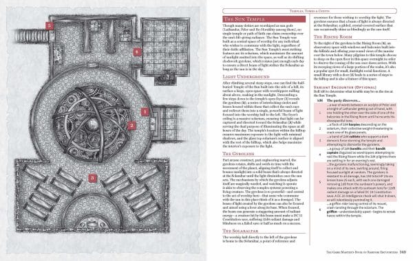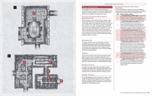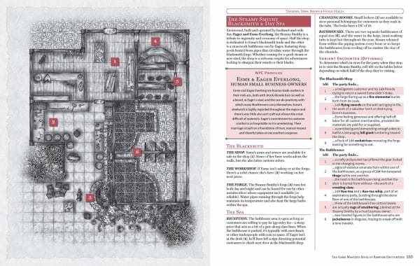 The Game Master’s Book of Random Encounters provides an unbeatable solution. This massive tome is divided into location categories, each of which can stand alone as a small stop as part of a larger campaign. Taverns, Inns, Shops & Guild Halls” section includes maps for19 unique spaces, as well as multiple encounter tables designed to help GMs fill in the sights, sounds, smells and proprietors of a given location, allowing for each location in the book to be augmented and populated on the fly while still ensuring memorable moments for all players. Each map is presented at scale on grid, enabling GMs to determine exactly where all of the characters are in relation to one another and anyone (or anything) else in the space, critical information should any combat or other movement-based action occur.
