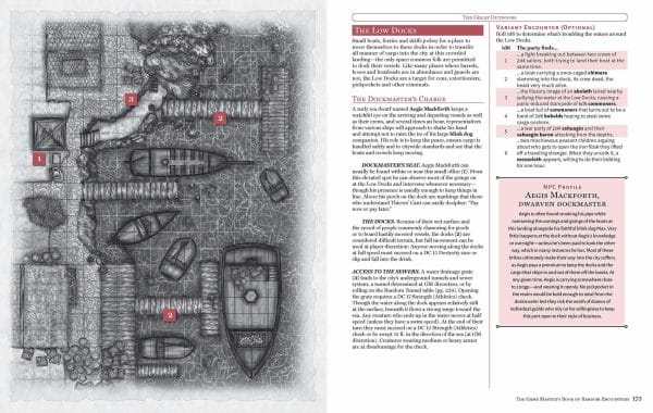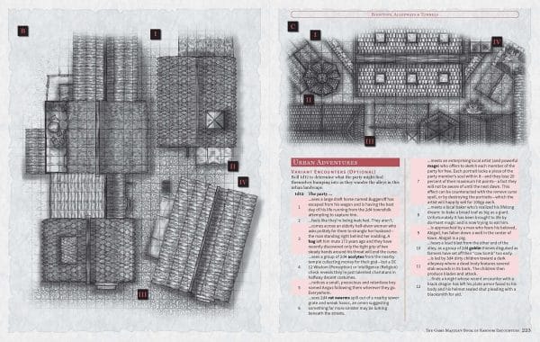 Locations include taverns, temples, inns, animal/creature lairs, gatehouses, courts, ships, laboratories and more, with adventure hooks that run the gamut from frantic rooftop chases to deep cellar dungeon-crawls, with a total of97 maps, more than 150 tables and millions of possible adventures.