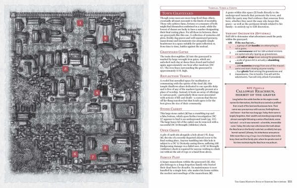Perhaps more useful than its nearly 100 maps, the book’s one-shot generator features all the story hooks necessary for GMs to use these maps as part of an interconnected and contained adventure. Featuring eight unique campaign drivers that lead players through several of the book’s provided maps, the random tables associated with each stage in the adventure allow for nearly three million different outcomes.