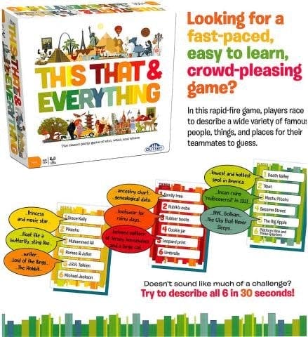 This That & Everything is a fast-paced, easy to learn, crowd pleasing party game. In this rapid-fire game, players race to describe a wide variety of famous people, things, and places for their teammates to guess – in less than 30 seconds!