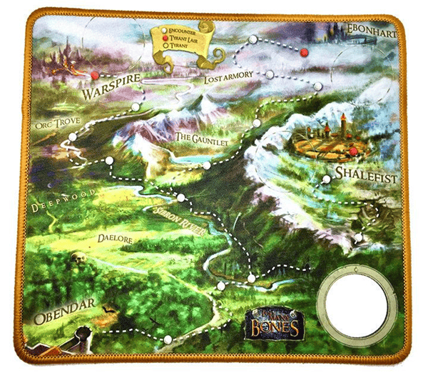 Adventure Map 2.0 gives you a visual way to track your progress points in both Too Many Bones and Too Many Bones: Undertow! Using the glass bead included with your core game box, the Adventure Mat replaces your Day Counter card and removes the need to manually track your progress. This two-sided beautiful neoprene mat features a labeled map of northern Daelore on one side and southern Daelore on the other. Illustrated by Anthony LeTourneau, the Adventure Map 2.0 is also edge-stitched for added durability and beauty.