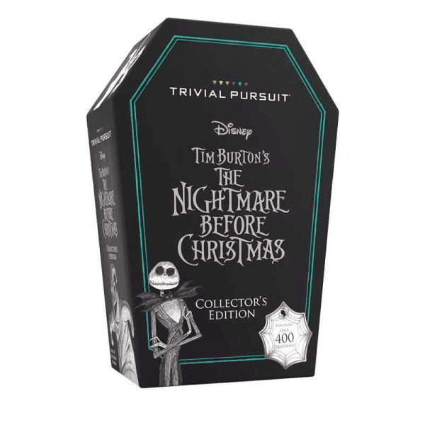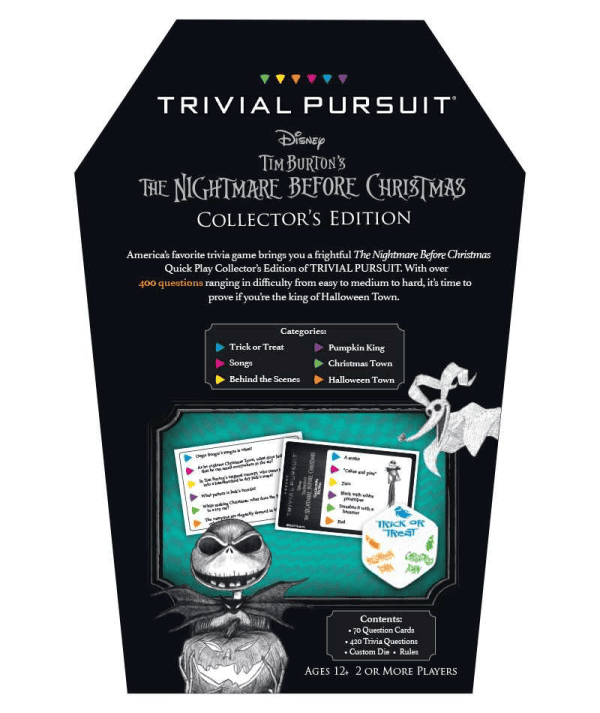Tim Burton’s The Nightmare Before Christmas Trivial Pursuit Travel Edition is the first and only game where fans can test their knowledge of this holiday classic with 420 trivia questions about the music, iconic movie characters, the Pumpkin King himself…and much more!