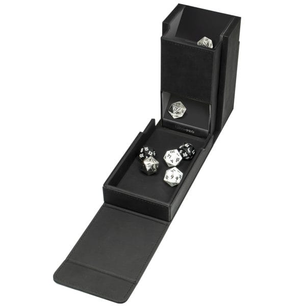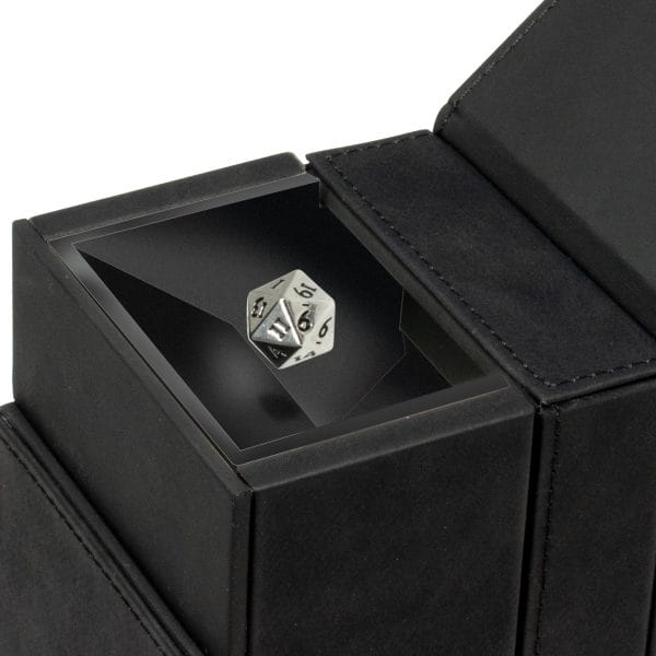 The Alcove Dice Tower is the ultimate tabletop gamer’s companion. Equipped with a soft suede leatherette exterior and durable core, you can store and roll dice all in a single 3.75 in. x 3.35 in. x 5.90 in. space. The lid flips down to release dice into a walled dice catching tray. Drop dice through 3 injection molded ramps to ensure durability and randomized rolls. When you are done playing, you can flip up the attached tray to store 40+ standard sized RPG dice and secure the dice tower shut with the strong magnetic closure that Ultra PRO’s Alcove accessories are famous for. (Dice not included)