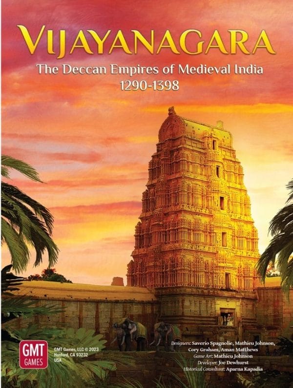 Vijayanagara is the first game in the new Irregular Conflicts Series. with gameplay inspired by GMT’s COIN system, players will take on the asymmetric roles of the Delhi Sultanate, the Bahmani Kingdom, and the Vijayanagara Empire, navigating event cards and unique action menus as they contest to write themselves into medieval Indian history. Players will rally local amirs and rajas to their cause, construct epic temples, forts, and qasbahs, and battle for supremacy over the Deccan plateau.