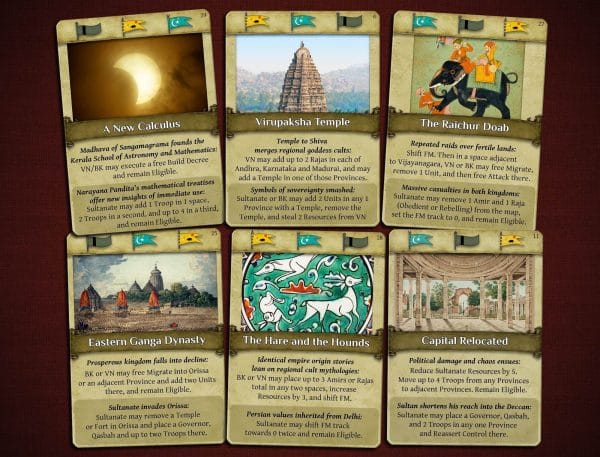 Gameplay and turn order is organized around a deck of unique event cards. With each new card, factions have the option to carry out the event or to select from faction-specific Commands and special Decrees; Commands such as the Conscription of new troops, Governing in Tributary Provinces, and Migration to begin life anew, and Decrees ranging from Demanding Tribute, Conspiring with Delhi’s Governors to betray the Sultan, and forming new Alliances with minor regional powers.