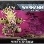 This multi-part plastic kit contains the components necessary to assemble a 7-man squad of Plague Marines. Each is posed dynamically, with the usual Death Guard accoutrements – cracked, rotting armour revealing grasping tentacles, severed heads displayed proudly on belts, backpacks sloshing with unnatural diseases and pipework leading from rebreathers to Nurgle knows what foul concoctions. There’s an Icon of Despair included, so your unit can feature an icon bearer.