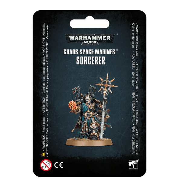 This plastic kit is comprised of 9 components and builds one Chaos Space Marines Sorcerer armed with a force stave. The model comes supplied with a Citadel 40mm Round Base.