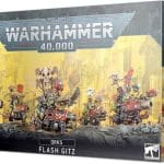This multi-part plastic boxed set contains three Meganobz and a Grot Oiler. Each Meganob is armed with a power klaw and a twin-linked shoota (which can be upgraded to a kombi shoota-rokkit launcha or a kombi shoota-skorcha). In addition to the deadly dakka, this kit also has enough killsaws to give each of your Meganobz a pair.