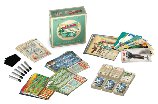 Welcome to.. Collector Edition contains also 6 alternate versions of the classic Welcome to… sheet, completely re-imagined and illustrated by world renowned artists : Vincent Dutrait, Beth Sobel, Weberson Santiago, Christine Alcouffe, Ryan Goldsberry and Maud Chalmel. It also adds 35 new cards for increased replayability, and 6 boxes for easy storage, all in a small « Welcome to the Moon » format.