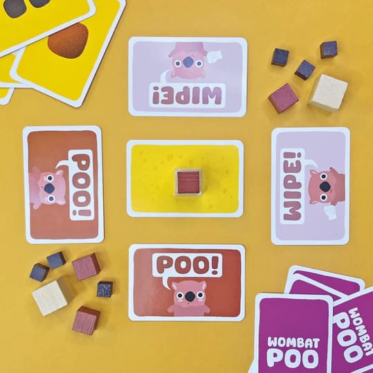 Did you know wombat poo is shaped like cubes? It’s true! In this game you take turns stacking poo cubes of different sizes onto a teetering tower. Choose the right time to score one point per cube in the tower and exit the round. But don’t wait too long, or the tower will fall over and you’ll score nothing!