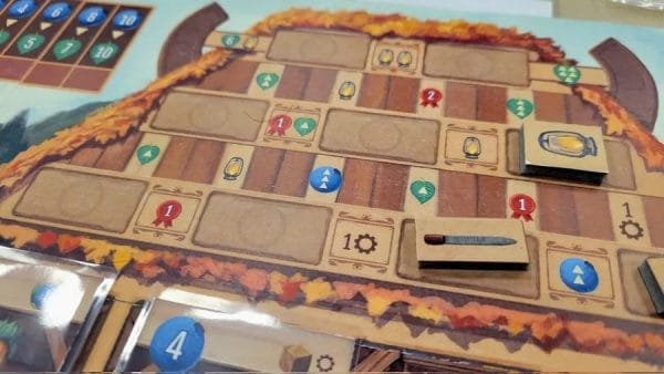 During the game, players complete their projects with wood (dice) that can be cut down to size, glued back together, and adjusted using dice manipulation to be as efficient as possible with their resources.