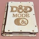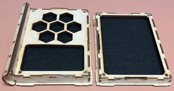 A perfect gift for your party wizard or spell caster! These beautifully stained tomes have black felt lined bottoms to protect your precious dice and cards. Laser cut from birch, they have room for a full 7 dice set, plus a space to hold a deck of cards. The lid has a magnetic closure to keep things tidy, and completely separates to become a small dice tray as well. Available in several designs and stains these tomes are a great way to improve your TTRPG experience.