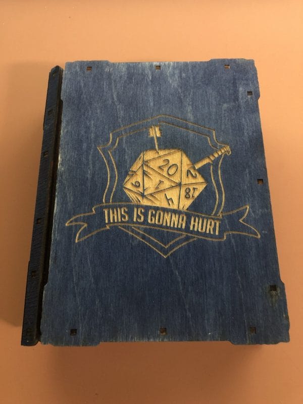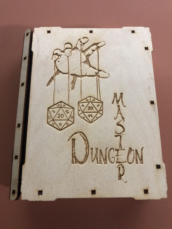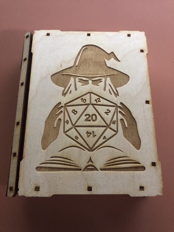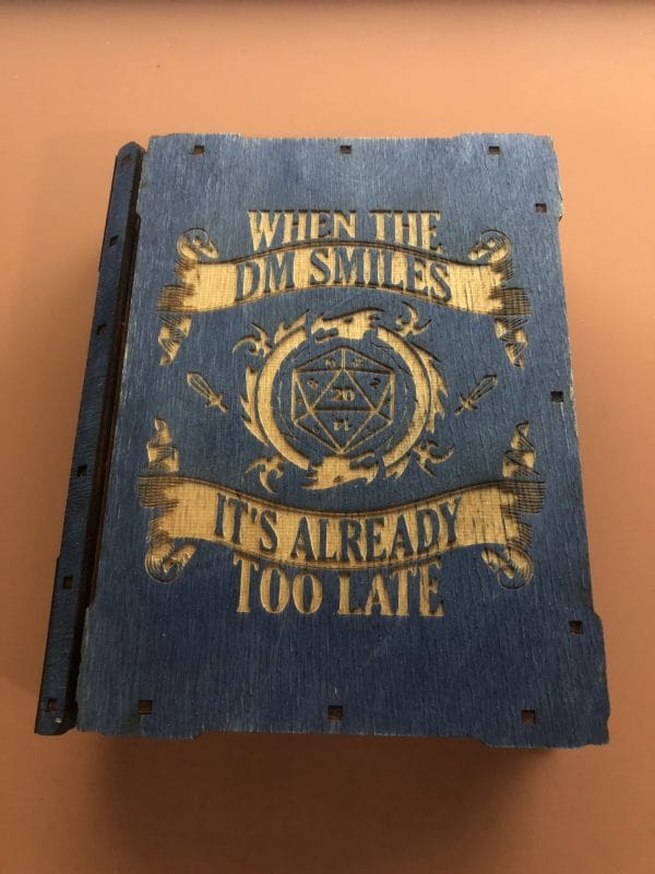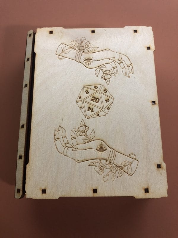 A perfect gift for your party wizard or spell caster! These beautifully stained tomes have black felt lined bottoms to protect your precious dice and cards. Laser cut from birch, they have room for a full 7 dice set, plus a space to hold a deck of cards. The lid has a magnetic closure to keep things tidy, and completely separates to become a small dice tray as well. Available in several designs and stains these tomes are a great way to improve your TTRPG experience.